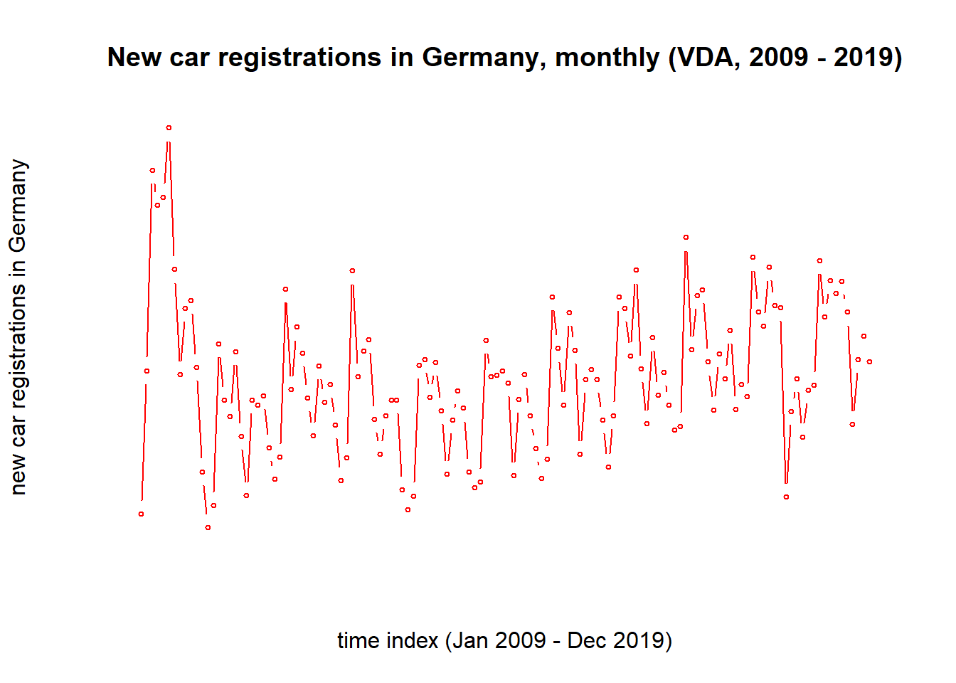 main = "New car registrations in Germany, monthly (VDA, 2009 - 2019)",
